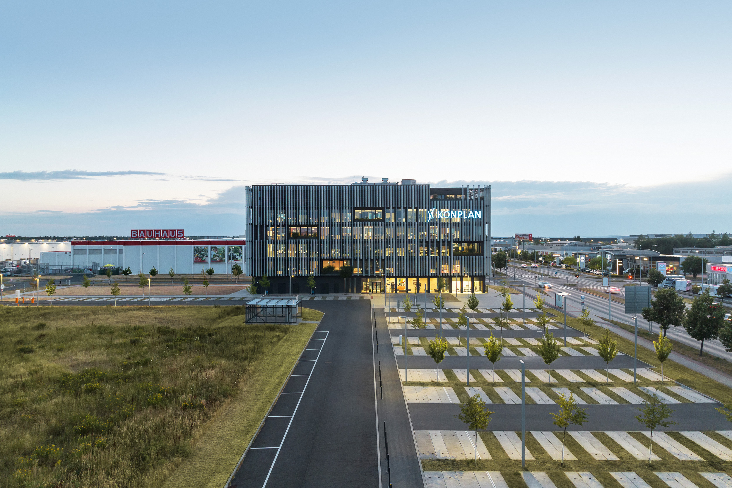 Na parkovací ploše pro více než 130 osobních vozidel se podařilo propojit funkčnost s prvky modrozelené infrastruktury, které čistě účelovou plochu povýšily na absorbent dešťové vody a útočiště drobných živočichů. Na budovu Konplan byly navíc umístěny včelí úly.